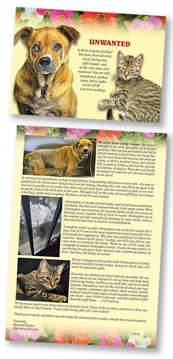 The theme of the piece is “UNWANTED”, and tells the story of a senior dog, left horribly neglected and sick, then abandoned on the street, and a 5 month-old kitten, put out on the fire escape in the dead of winter as punishment by an angry owner. The outer envelope and card front show Emily (the dog) and Christopher (the kitten) as they looked when they arrived at the humane society. The interior of the card (above) details what the humane society did for these two, how they took care of all their medical needs, and best of all, found them loving homes. The back of the card shows the dog’s happy adoption day photo. In addition, the recipient received a packet of Thumbelina Zinnia seeds, encouraging the donor to enjoy planting and growing them as they can help the organization grow and help more animals like these. The response document and BRE, continue the theme of these two animals and images of the zinnias.