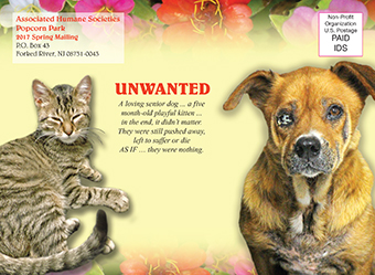 Featured in this post are the components of a fundraising package I created (wrote and designed from start to finish) for the Associated Humane Societies, a humane society I’ve been working with for 30+ years. They are a hard-working organization dedicated to taking in the animals that society has discarded and giving them a brand new, loving future. I’d say their donor base falls in between the hard left humane organizations which don’t hesitate to show you the most brutal images of animal cruelty and the soft right which focuses more on cute puppies and kittens. So the pieces I work on with them have to be honest, but not so raw that people want to throw the piece away without really looking at it. If you don’t get the recipient to open the envelope, you’ve lost the donation. This particular package is mailed to their regular donor list, but with minor adjustments, could be easily used in a cold mailing.